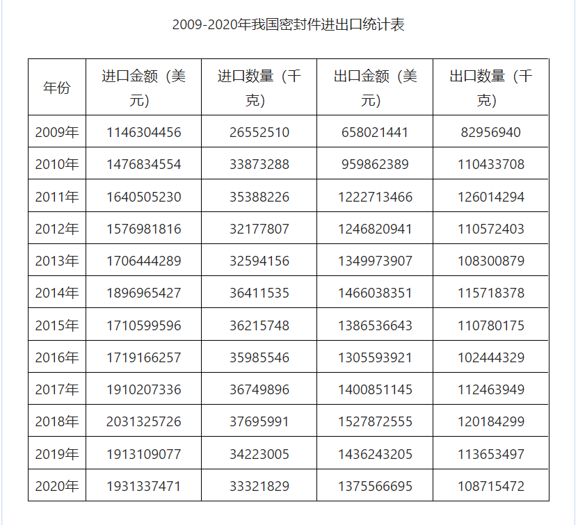 我國密封件行業(yè)經(jīng)過不斷發(fā)展,現(xiàn)階段已經(jīng)取得了長足進(jìn)步,生產(chǎn)的產(chǎn)品基本可以滿足國內(nèi)需求,成為我國機(jī)械工業(yè)發(fā)展所需的重要基礎(chǔ)產(chǎn)業(yè)。數(shù)據(jù)顯示,2020年我國密封件產(chǎn)量為159.45萬噸,同期進(jìn)口數(shù)量為3.33萬噸,出口數(shù)量為10.87萬噸,我國密封件表觀消費(fèi)量為151.91萬噸。