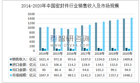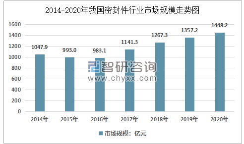 2014年我國密封件市場規(guī)模為1047.9億元,2020年我國密封件市場規(guī)模增長至1448.2億元,2014年以來我國密封件行業(yè)規(guī)模復(fù)合增速為5.54%。