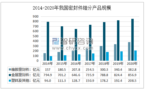 密封件市場主要分為橡膠密封件、金屬密封件、塑料密封件等,2020年我國橡膠密封件市場規(guī)模為382.8億元,占同期規(guī)??偭康?6.43%;金屬密封件市場規(guī)模為856.9億元,占同期規(guī)模總量的59.17%;塑料及其他密封件市場規(guī)模為208.5億元,占同期規(guī)??偭康?4.40%。