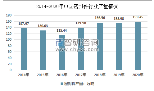 智研咨詢發(fā)布的《2021-2027年中國密封件行業(yè)市場運(yùn)行態(tài)勢及發(fā)展前景研究報(bào)告》數(shù)據(jù)顯示:幾年,我國密封件行業(yè)產(chǎn)量整體呈現(xiàn)增長態(tài)勢,從2014年的137.97萬噸增長到了2020年的159.45萬噸。近幾年我國密封件行業(yè)產(chǎn)量情況如下圖所示: