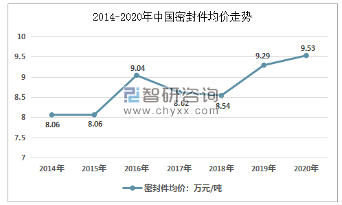 近幾年我國密封件市場均價(jià)總體保持波動(dòng)上行態(tài)勢,行業(yè)市場價(jià)格波動(dòng)主要受經(jīng)濟(jì)運(yùn)行的景氣程度,原材料價(jià)格波動(dòng),已經(jīng)相關(guān)政策影響,同時(shí)下游各主要行業(yè)景氣程度,產(chǎn)品的需求結(jié)構(gòu)對行業(yè)產(chǎn)品價(jià)格走勢也有較大的影響。數(shù)據(jù)顯示,2019年我國密封件均價(jià)為9.29萬元/噸,2020年增至9.53萬元/噸。
