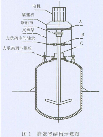 (4)設(shè)備整體找正找平。因為實際上密封的安 裝基準(zhǔn)面是釜殼體,而攪拌的安裝基準(zhǔn)面既有釜 殼體還有支架。就是說在整體安裝后,既要保證攪 拌和釜體的垂直對中,又要保證攪拌和密封的同 軸度,即從電機(jī)輸出軸端(聯(lián)軸節(jié)處)點A,到中間 支承軸承點B,再到密封中心點C,三點ABC為一 直線且垂直于水平面。參見圖1。